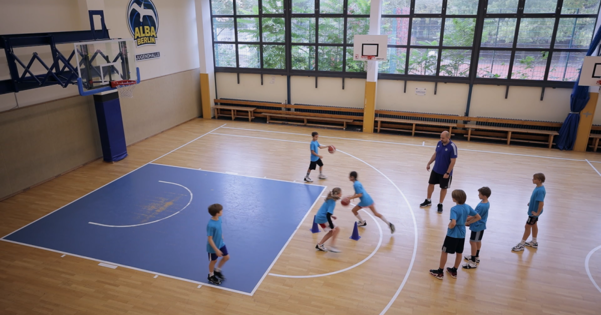In dieser Eins-gegen-eins-Variante erhält der Angreifer einen klaren zeitlichen Vorteil. Während der Angreifer bereits bereitsteht, muss der Verteidiger vor dem Verteidigen eine Drehbewegung um die Hütchen ausführen. Dadurch entsteht eine freie Angriffsseite, die der Angreifer mit Tempo und einem entschlossenen ersten Schritt nutzen soll. Je nach Leistungsstand kann der Vorsprung durch enger gestellte Hütchen verkleinert werden. Gespielt wird mit hoher Intensität, wobei der Fokus auf schnellem Entscheiden, direktem Zug zum Korb und sauberem Korbleger liegt.