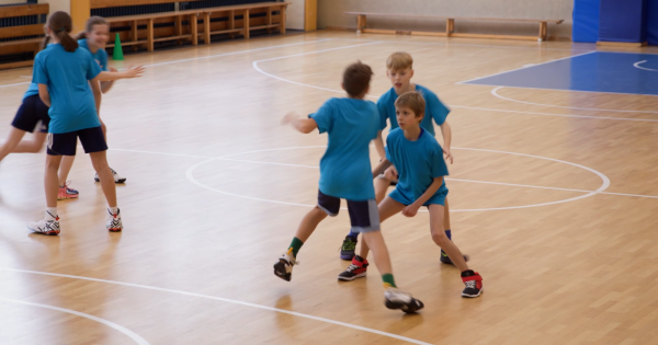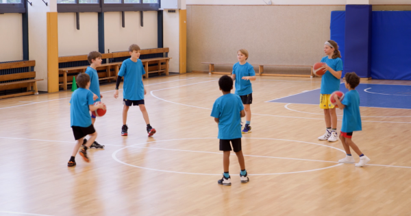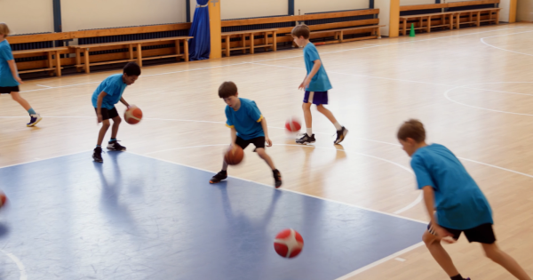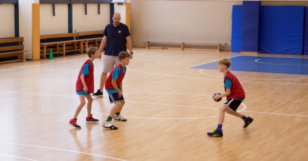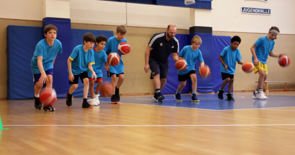 Dribbling im Hütchenwald ist eine Übung, die die Grundlagen des Ballhandlings vermittelt. In dieser Variante erhält wieder jedes Kind einen Ball, allerdings verzichten wir auf die Tellerhütchen. Dennoch wird wieder durch den Hütchenwald aus Pylonen gedribbelt. An einem Pylonen angekommen, machen die Kinder einen Handwechsel und starten danach mit einem Tempowechsel schnell zum nächsten Hütchen. Die Art des Handwechsels kann und soll variiert werden: etwa vor, zwischen, oder hinter den Beinen. Nach fünf Handwechseln dürfen die Kinder auf einen Korb einen Korbleger versuchen, für jeden Treffer gibt es einen Punkt.