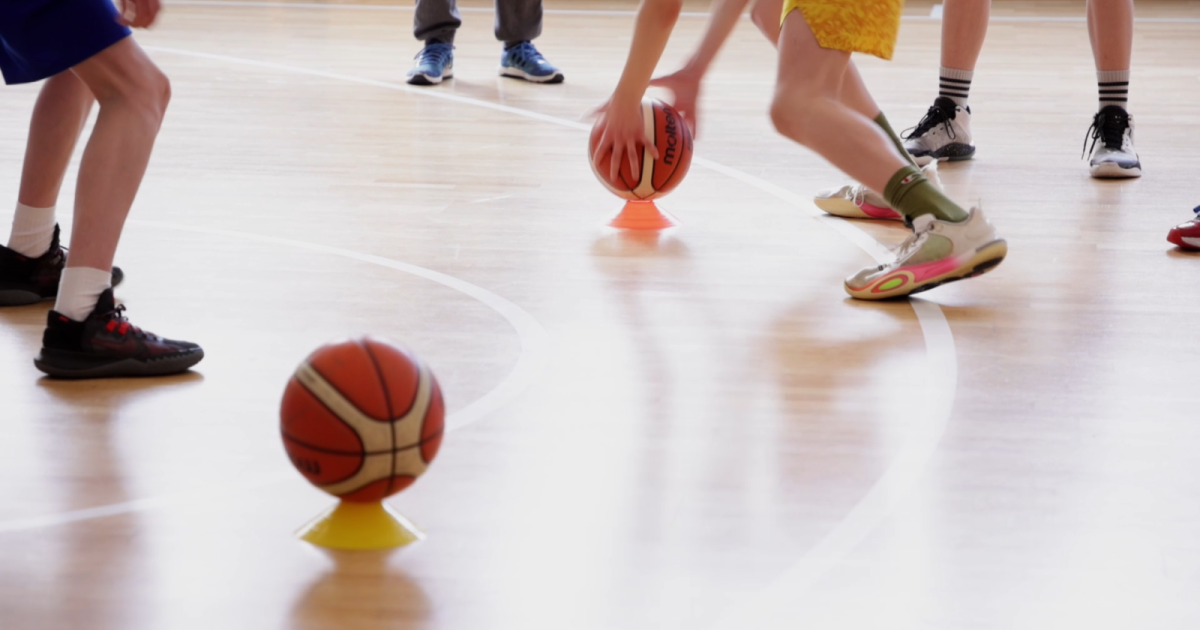 Bei Finte gewinnt spielen zwei Spieler:innen ohne Ball ein intensives Eins-gegen-Eins mit klarem Startsignal. Zwei Bälle liegen auf Hütchen und markieren die Entscheidungszone. Die Verteidigung positioniert sich zwischen den beiden Bällen und bewegt sich seitlich, während der Angriff durch Laufbewegungen und Finten versucht, die Verteidigung zu binden. Berührt der Angriff einen der Bälle, startet sofort das Eins-gegen-Eins auf den Korb. Gespielt wird, bis ein Korb erzielt wird, ein Defensivrebound erfolgt oder die Verteidigung den Ball erobert.