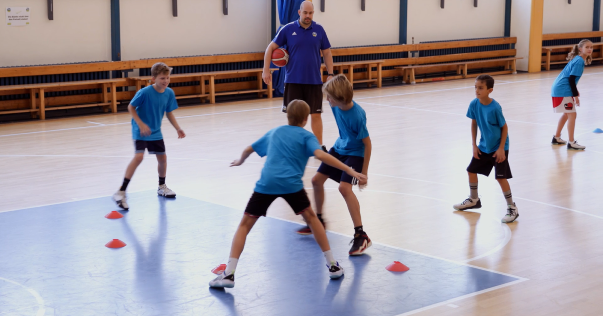 Beim Spiel Gefängnisausbruch üben wir schnelle Finten und und defensive Fußarbeit. Dazu bilden wir Gruppen aus vier Kindern, von denen drei als Wächter:innen fungieren und sich um einen Kreis aus Hütchen (= das Gefängnis) aufstellen. Das vierte Kind befindet sich in diesem Gefängnis und will daraus ausbrechen. Mit Täuschungen und schnellen Bewegungen versucht es, aus dem Kreis zu fliehen. Nach drei Durchgängen werden die Rollen gewechselt.
