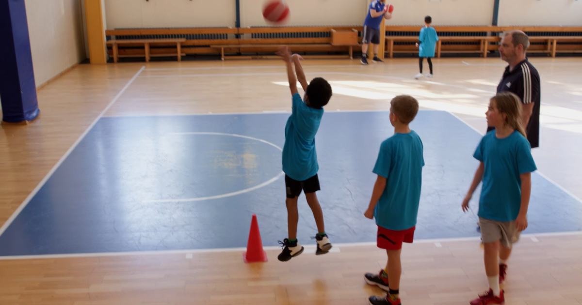 2. Die Kinder werfen nacheinander vom Hütchen aus auf den Korb.